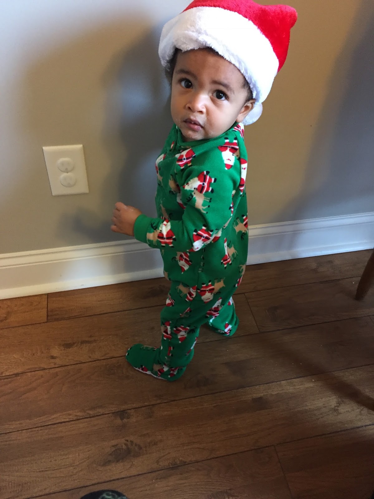 Carson loved his powdered donuts and muffins. Greg read him the Elf on the Shelf book and then he met his new Elf. Clyde the Elf has joined the Harrison family crazy. Clyde came in on Santa's sleigh. Clyde brought all three of us some Christmas pajamas. We enjoyed our breakfast on our new Rudolph plates.