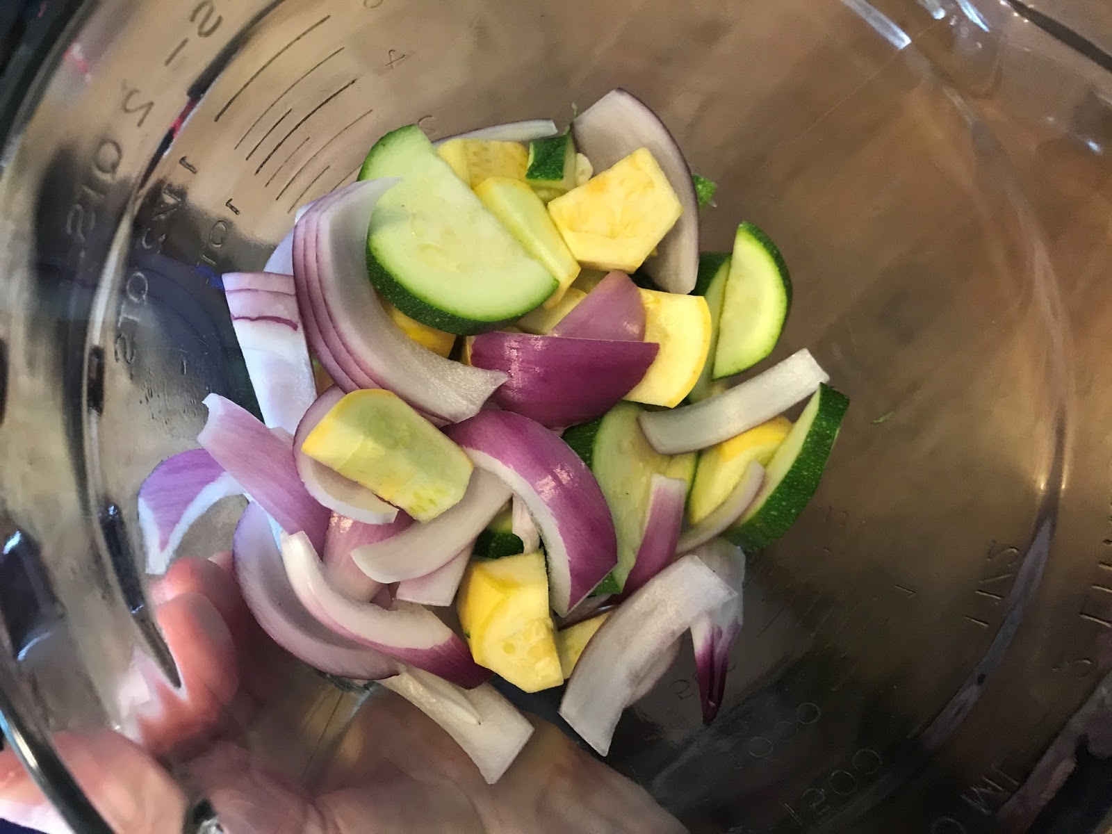 We also love our swimming Mickey Mouse and lots of splashing. We had planned to grill veggies and steaks but a storm that we did not see in the forecast quickly approached. We managed to grill the steaks but had to cook the veggies inside.